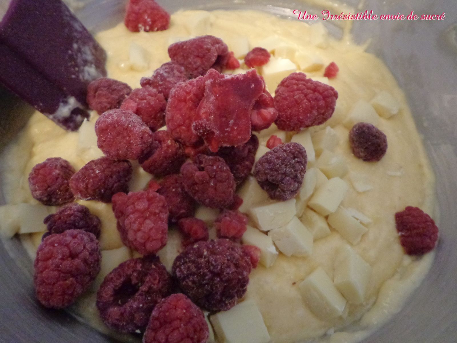 Détailler le chocolat blanc en petits dés. Ajouter délicatement le chocolat blanc et les framboises à la pâte.
