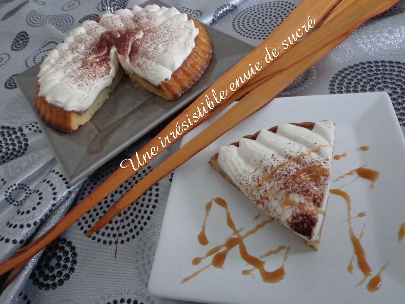 Retourner le fond de tarte dans une assiette ou un plat, verser à mi-hauteurde la sauce caramel. Mettre la chantilly dans une poche à douille et commencer à poser la chantilly en partant du centre vers l'extérieur.