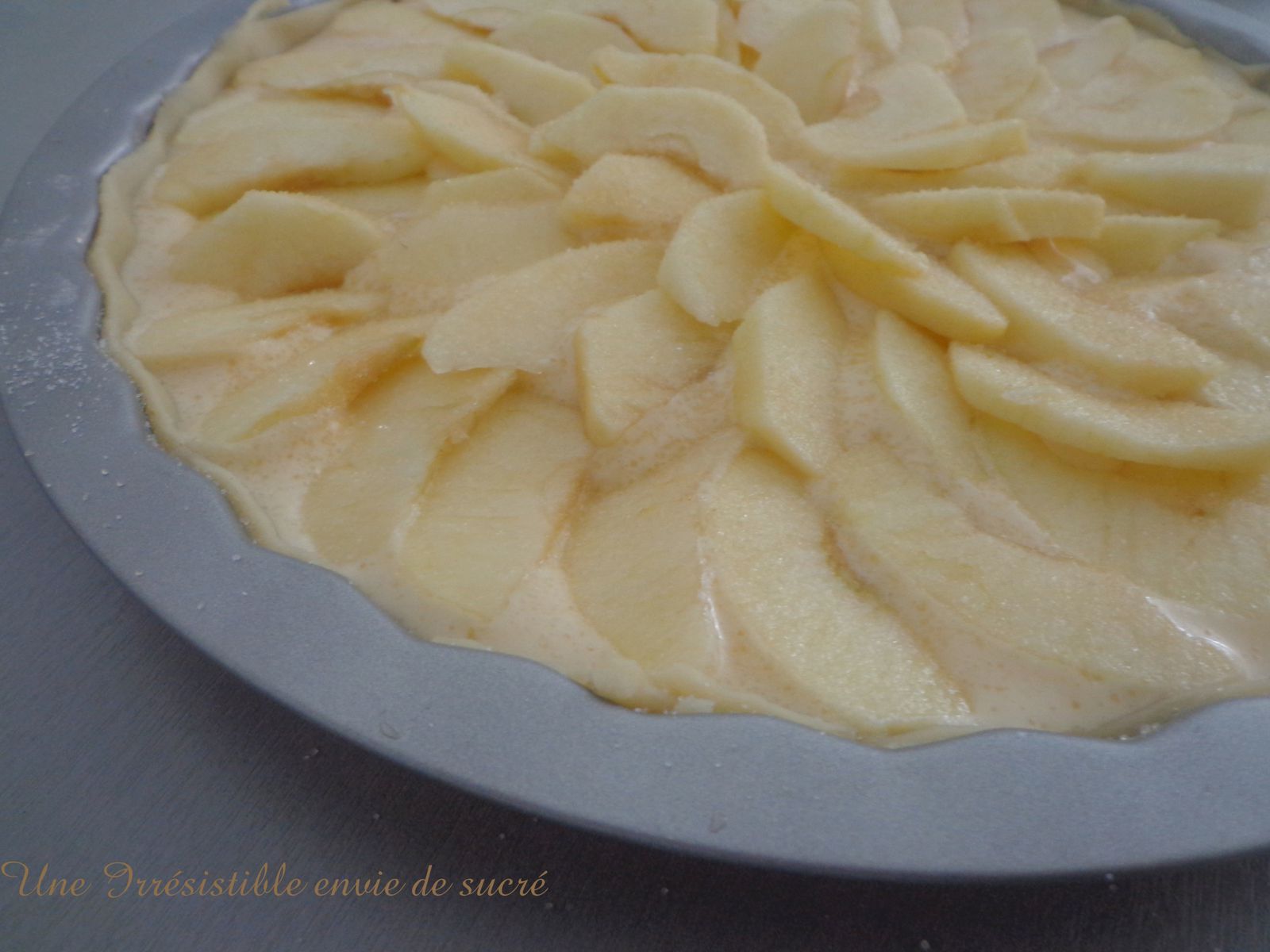 Verser votre crème sur la pâte et répartir les pommes coupées et pelées sur la crème.