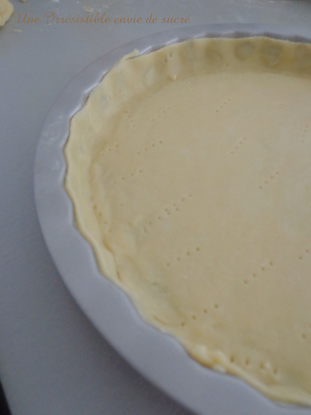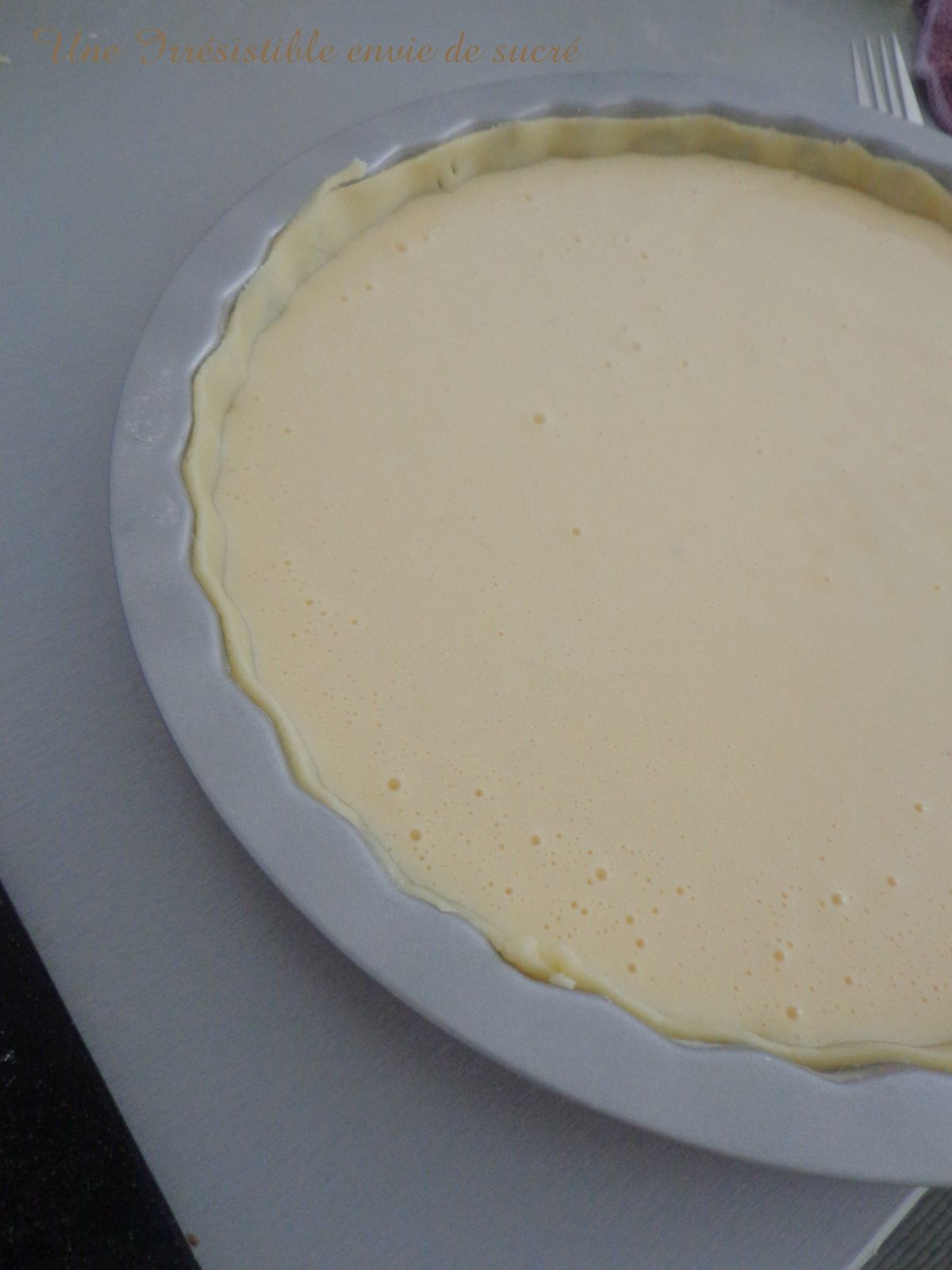 - Foncer un moule a tarte de 23-24 cm avec la pâte et cuire a blanc (recouvrir d'un morceau de papier sulfurisé et de billes) 15 min a 180 degrés et laisser tiédir.