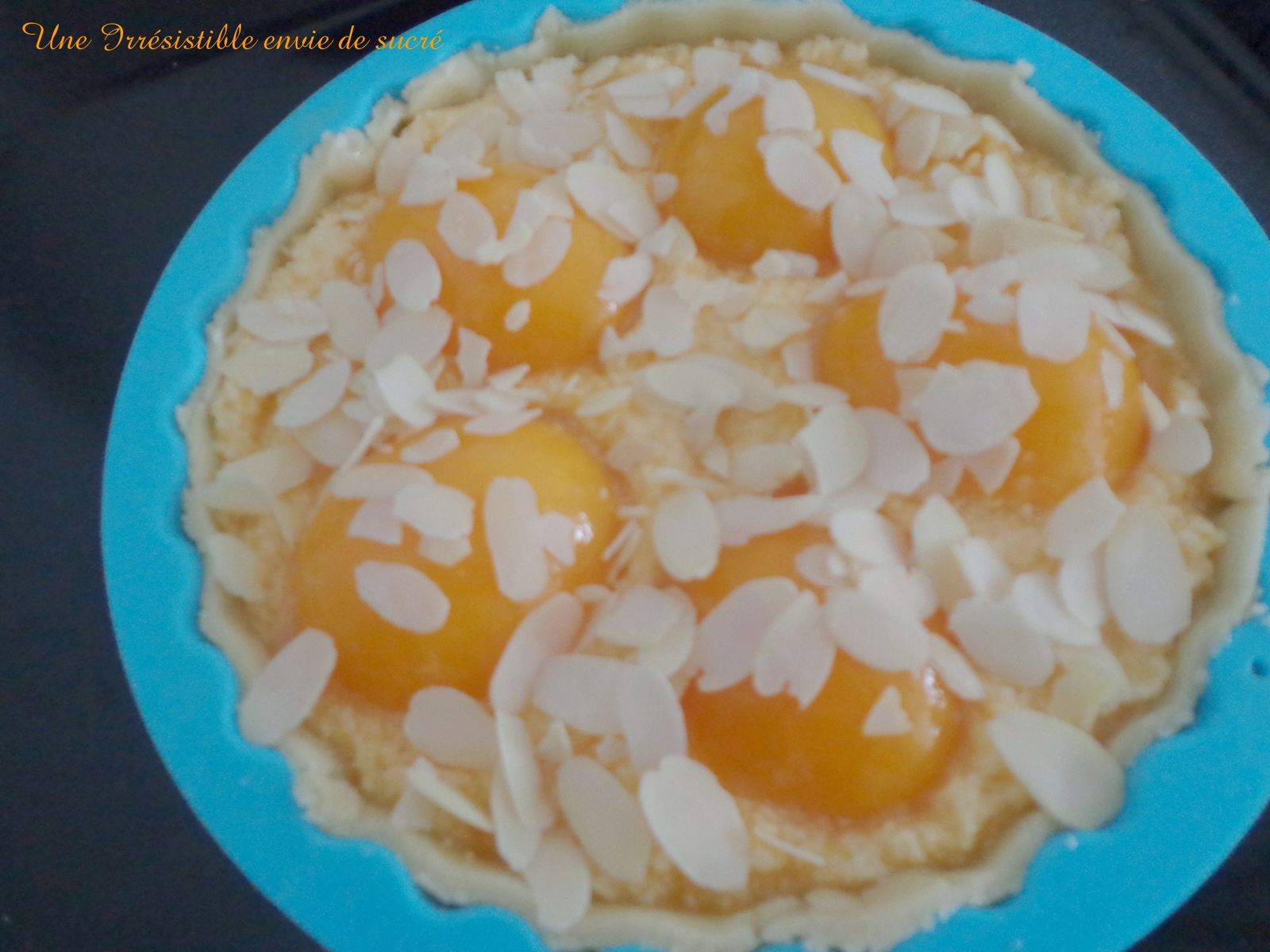 Disposez cette préparation sur le fond de votre pâte sablée. Placez dessus les pêches (ou autre) et soupoudrez le tout d'amandes effilées.