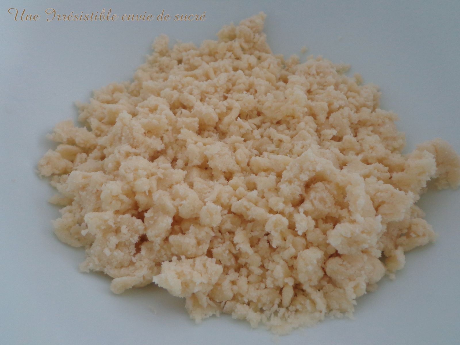 Dans un saladier mettre la farine , le sucre , la vanille , la pincée de sel et le beurre coupé en dés , du bout des doigts sabler le mélange , vous pouvez aussi le faire au robot comme moi .