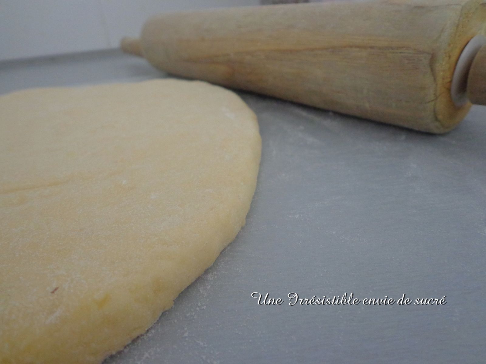 - Fariner le plan de travail ( une surface froide ou un papier sulfurisé) , sortir la pâte du frigo et l'étaler au rouleau afin d'obtenir un rectangle de 4 a 5 mm d'épaisseur environ, cette opération dois aller assez vite car la pâte tient avec le froid et ramollit avec la chaleur , je vous conseille d'étaler votre pâte sur un papier sulfurisé pour pouvoir la placer quelques minutes au congélateur avant de commencer a la garnir.