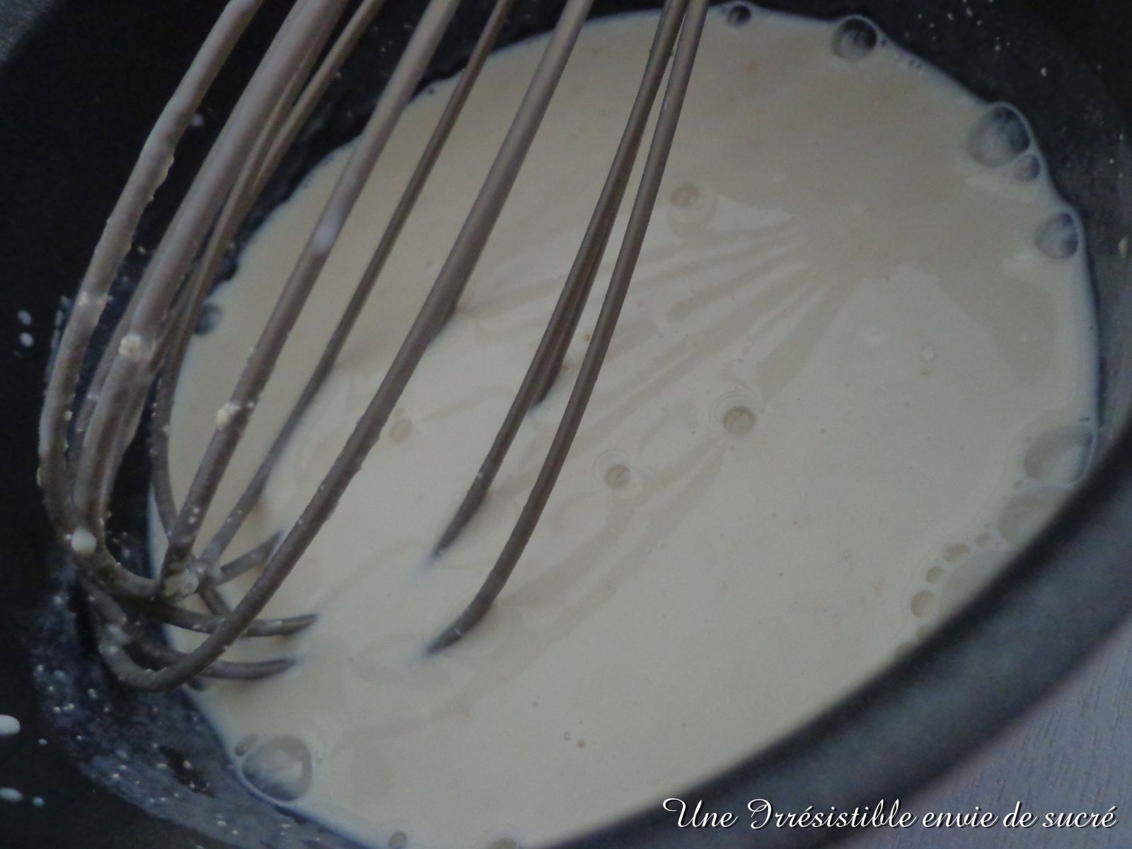 - Lorsque le lait arrive a ébullition , retirer la gousse de vanille et verser le lait sur le mélange oeufs-farine tout en fouettant.